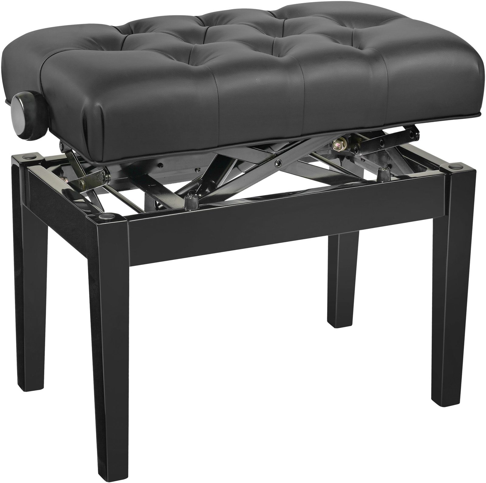 Ce banc de piano extrêmement confortable est équipé de vérins pneumatiques haute performance. La hauteur réglable en continu de 470 à 570 mm est également idéale pour les écoles de musique. La finition noir brillant et le revêtement en similicuir noir avec clous décoratifs lui confèrent un aspect élégant. Les pieds de nivellement garantissent une stabilité parfaite.