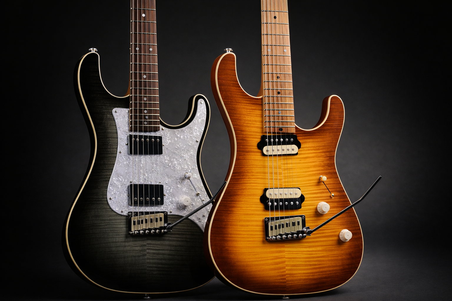 Les deux modèles intègrent des éléments précis qui impactent directement le jeu. Le manche profilé en “low C” et la finition satinée limitent les frottements. Le radius de 14 pouces permet une action basse sans frise. Le vibrato EKO à 2 pivots assure une utilisation stable, tandis que les mécaniques à blocage améliorent la tenue d’accord. Le sillet en os et la fixation manche 5 points contribuent à la transmission des vibrations et à la stabilité globale de l’instrument.