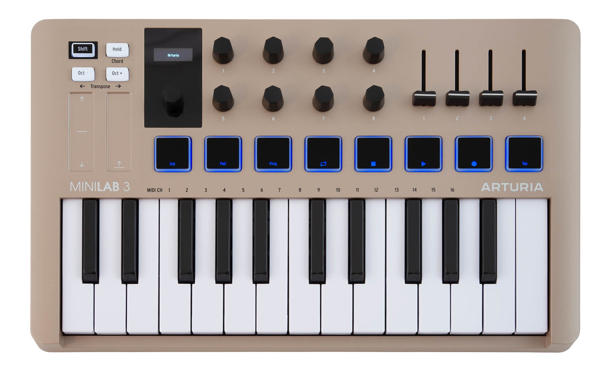 Inspiré du célèbre MiniLab 3, le modèle Champagne Edition s’offre une robe dorée subtile et moderne, accompagnée de pads RGB vibrants. C’est un instrument qui attire l’œil sans en faire trop — parfait pour les créateurs qui veulent un setup à la fois professionnel et stylé. Compact et léger, il s’intègre aussi bien sur un bureau de home-studio qu’en live sur scène.