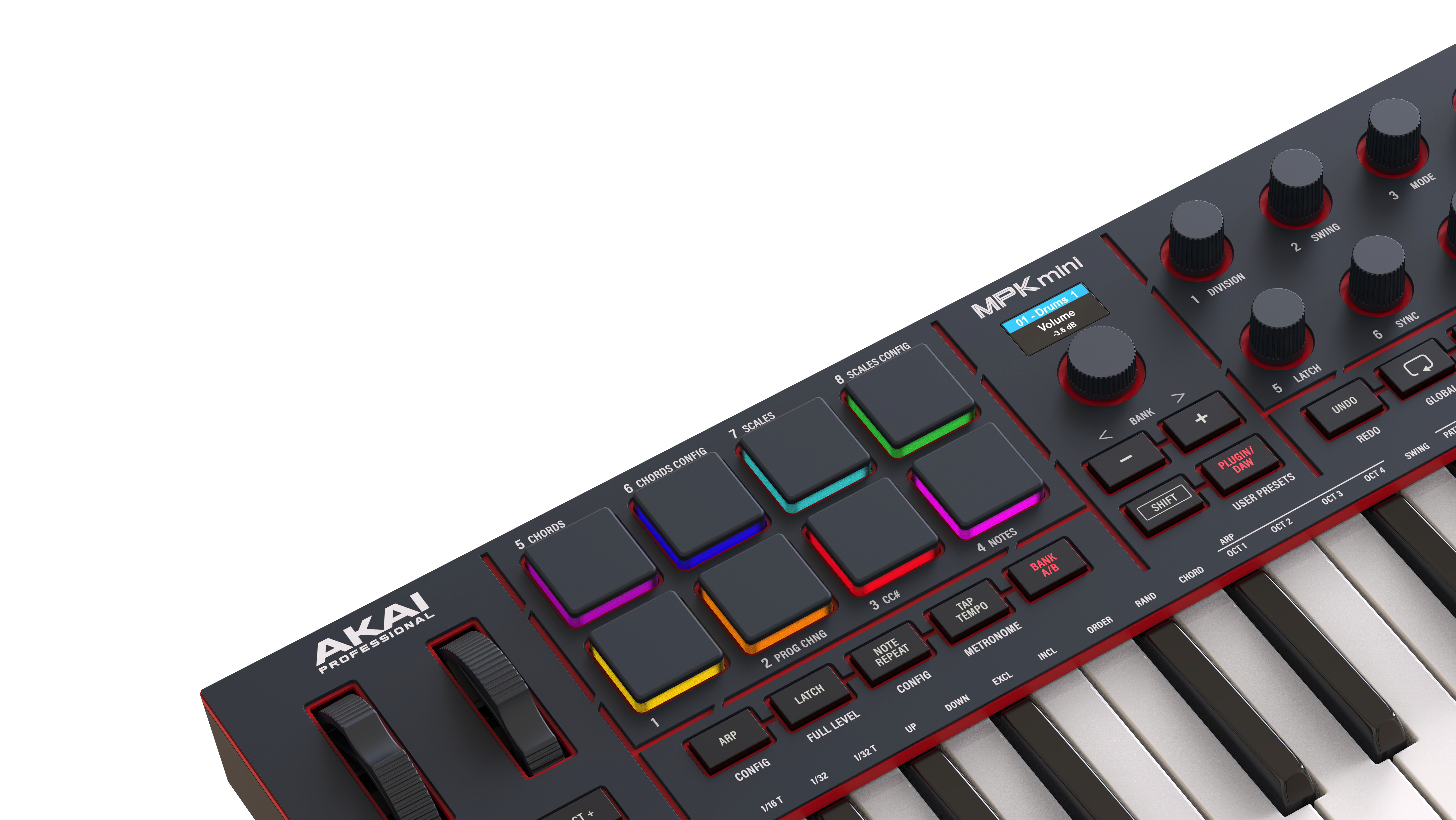 Le MPK Mini IV inaugure un tout nouveau clavier élargi avec des touches plus grandes et un mécanisme retravaillé. Le confort de jeu s’en ressent immédiatement : la dynamique est plus fine, la précision accrue. Les nouvelles molettes de pitch et de modulation remplacent le joystick des versions précédentes pour un contrôle plus fluide et instinctif. AKAI signe ici une évolution sobre mais décisive.