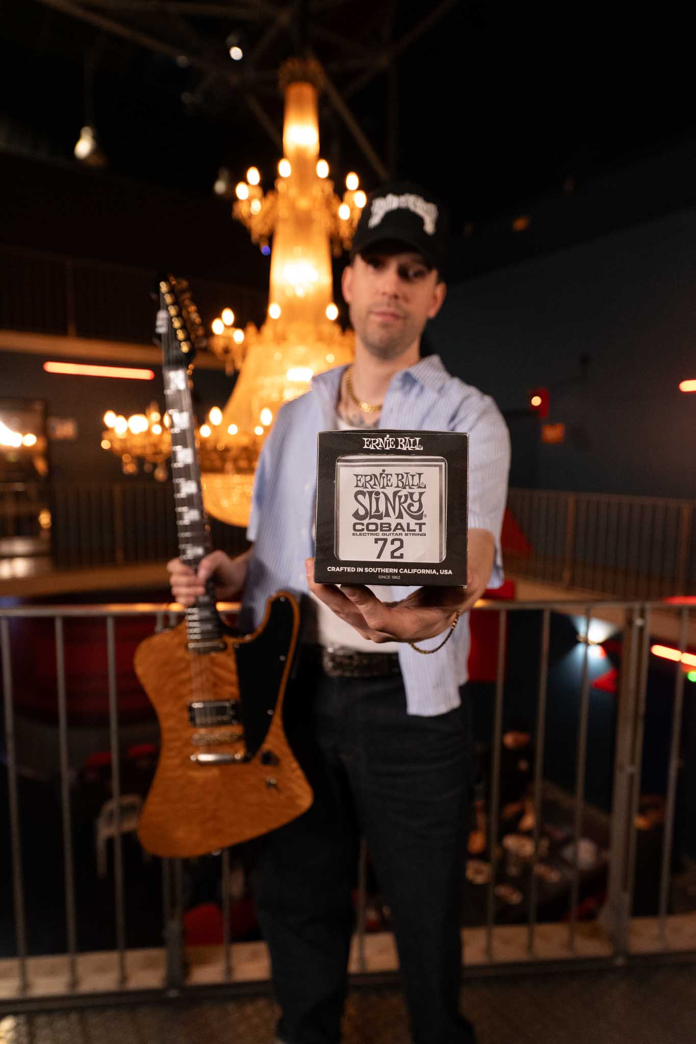 "On s'est concertés avec Ernie Ball pour me créer un jeu de cordes bien particulier. Je suis apparemment le seul au monde à utiliser les Cobalt en 72. Je suis très content que l'on ai pu mettre ça en place. Surtout de pouvoir jouer sur un jeu qui me correspond vraiment."