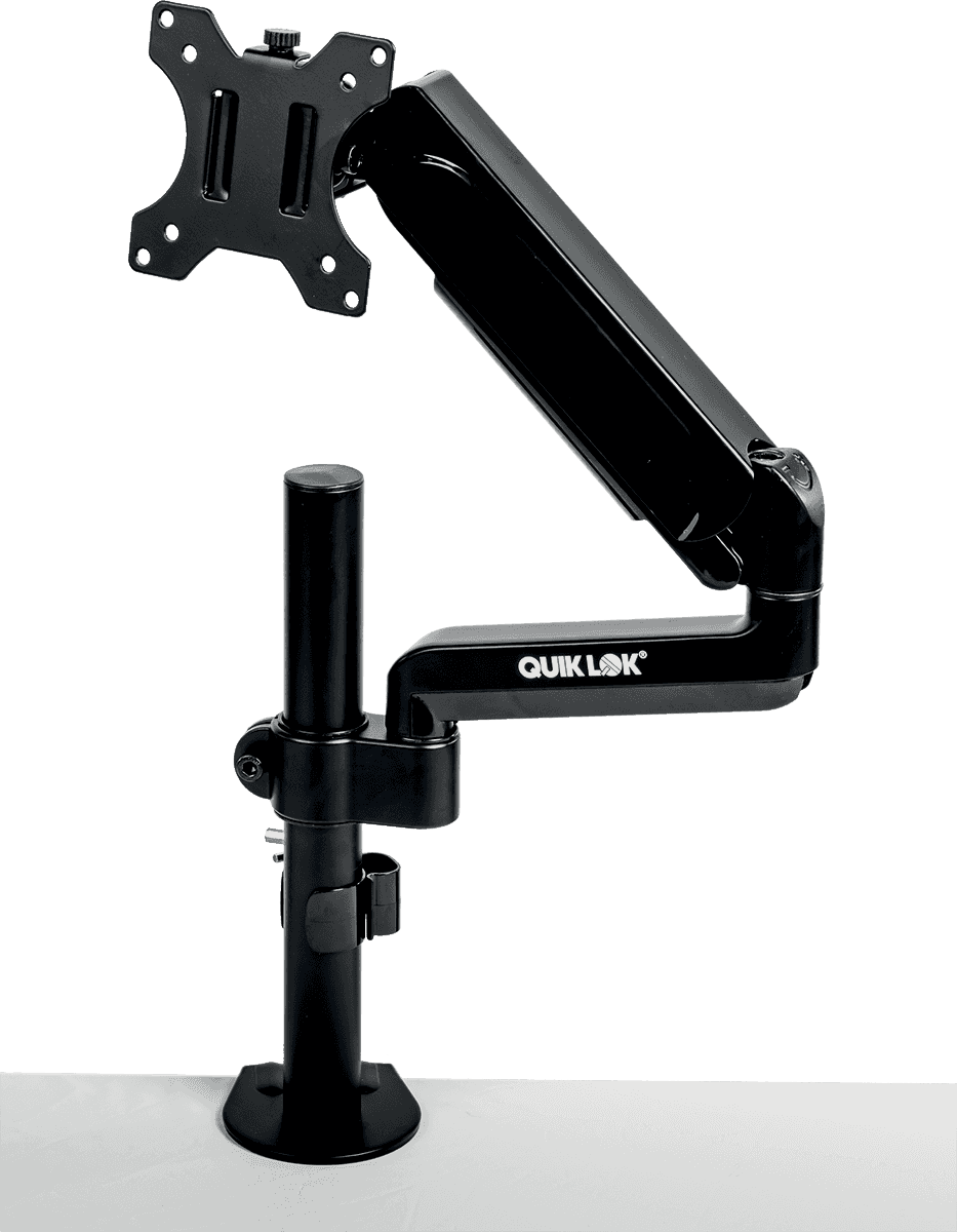 La majorité des supports fournis avec le moniteur sont généralement dépourvus de systèmes de réglage permettant de l'adapter à votre poste de travail. Le remplacer par un dispositif dédié, surtout si vous utilisez une configuration multi-moniteurs, est un moyen facile d'optimiser votre espace de travail. Pour ce faire, Quik Lok a conçu le VSC/001, un stand moniteur doté d'un bras avec système pneumatique qui garantit solidité et facilité de réglage.