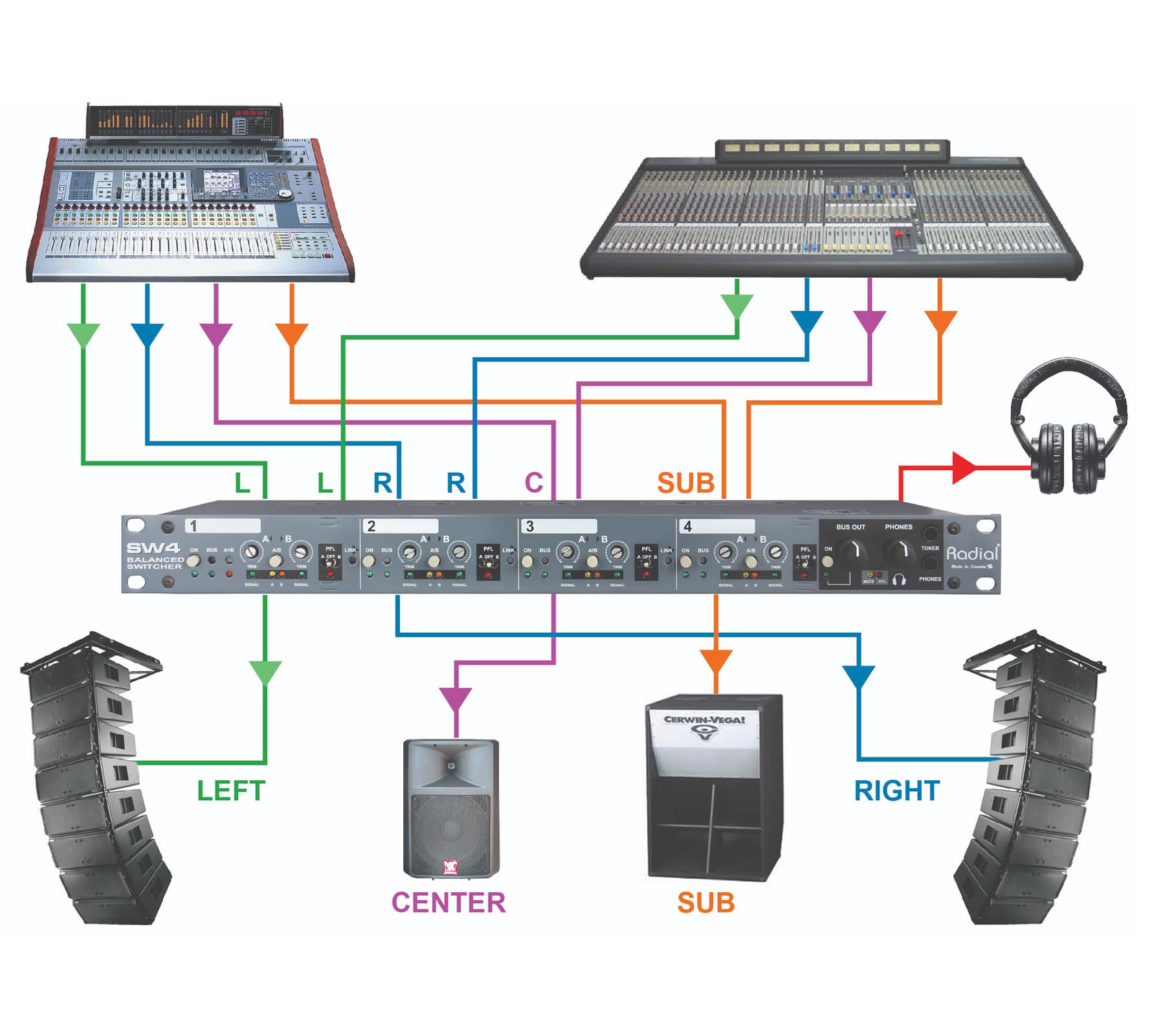 Le Radial SW4 est un switcher audio symétrique 4 canaux conçu pour les systèmes sans fil, les consoles de mixage et les processeurs numériques guitare. Il permet un 'backup' des sources pour une plus grande flexibilité opérationnelle dans les environnements live. Chacune des 4 voies est équipée de 2 entrées XLR et d'un transformateur de sortie isolé, capable d'encaisser +20 dB de signal à toutes les fréquences. Cela rend le SW4 aussi viable tant pour les systèmes micro sans fil que pour la commutation de consoles de mixage. Les canaux peuvent être 'linkés' en stéréo, triple ou quadruple commutation et des SW4 supplémentaires peuvent être associés à des configurations plus importantes, commandées à distance si nécessaire. Le canal1 est agrémenté d'une fonction 'mix' qui somme passivement les 2 entrées ensemble pour une utilisation simultanée. Tous les canaux sont dirigés vers un Master bus, respectivement 1/3 assignés à gauche, et 2/4 à droite. Pour monitorer, chaque canal, le SW4 est équipé d'un commutateur PFL 3-positions qui sélectionne entre la source A, B ou le bus stéréo via l'ampli casque intégré. Le bus peut être commuté en mono quand il est employé avec des systèmes sans fil guitare. Ceci est complété par 2 sorties guitare isolées et un contrôle de niveau global assorti d'une sortie mono sur le panneau avant pour 'attaquer' un ampli moniteur, tuner ou ampli guitare. Ces caractéristiques combinées font du Radial SW4 le choix idéal pour les systèmes de backup ou commuter de multiples canaux audio simultanément.