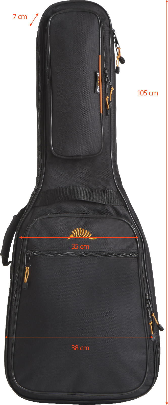 La fermeture éclair de 10 mm avec tirette élastique orange garantit une fermeture fiable et facile. La poche avant, enrichie du logo "Armadillo" brodé, présente un compartiment située au niveau du corps de l'instrument avec deux séparateurs zippés, offrant un espace pratique et protégé. De plus, une poche supérieure avant située au niveau du manche vous permet de ranger soigneusement les accessoires.